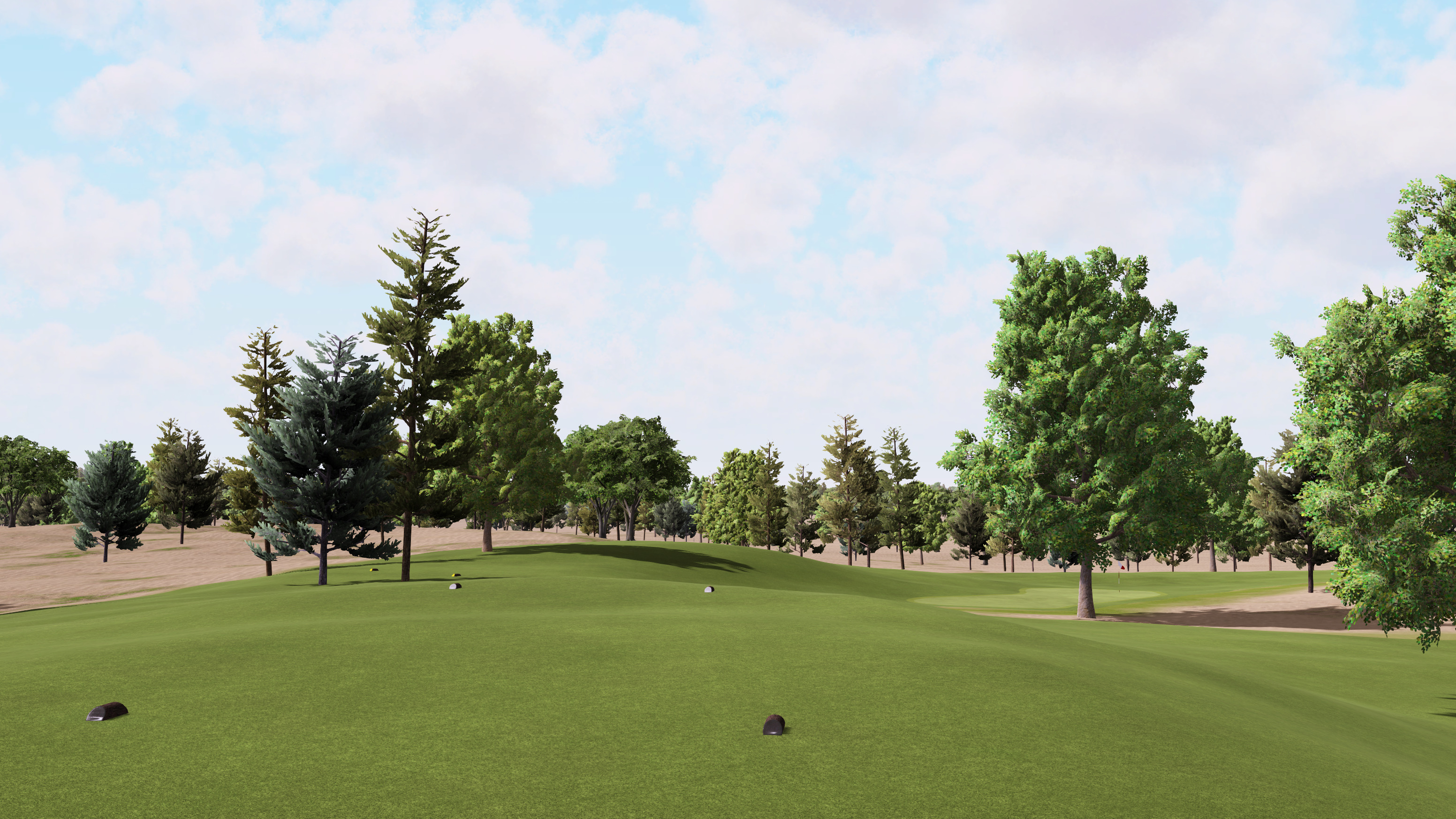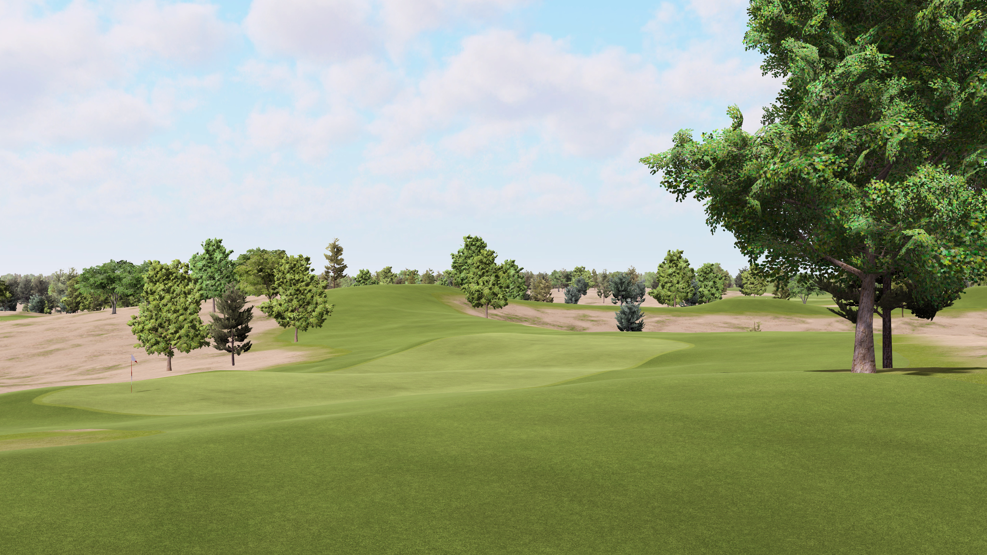 The firm conditions simulate the compact sandy soil at Sand Valley. Even after a large amount of rain, the terrain at Sand Valley plays firm. Besides simulating the real world setting, I strategically designed the course with hard firmness in mind. Multiple options for line of play using various slopes are not as viable in softer conditions. As a part time member of the grounds crew at Sand Valley, I sometimes see the greens stimped and they typically fall somewhere between 11 and 12. I placed pins in such a way that if you crank it up to 14 it still plays fair though. Due to the wide open nature of the location, there is typically at least a strong breeze there, if not more.